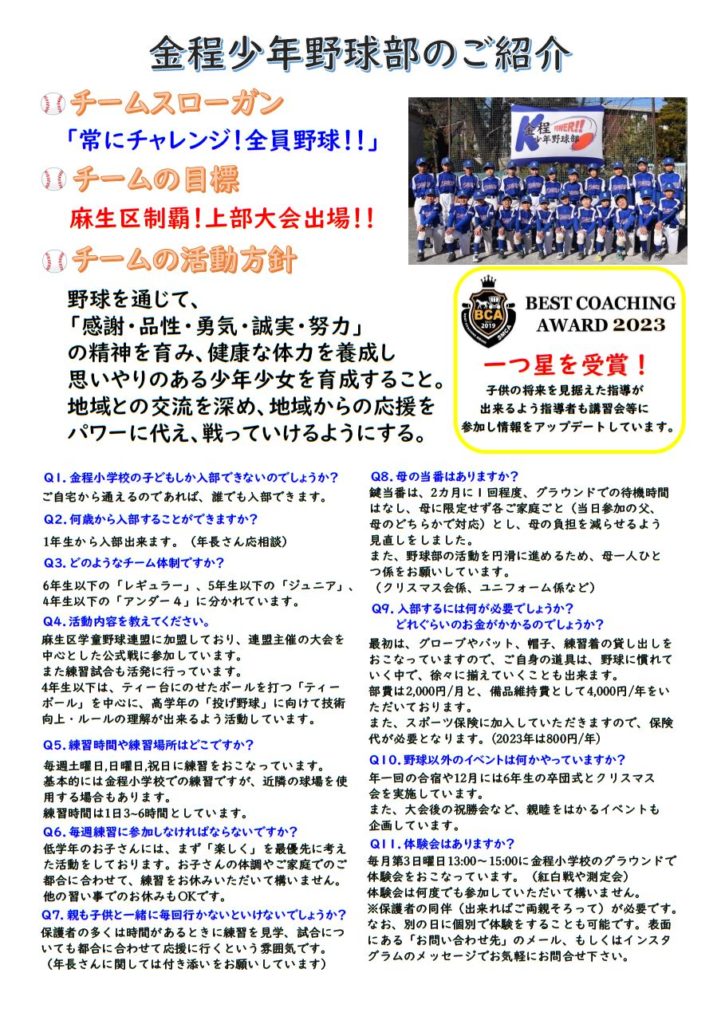 案内・紹介 【ご紹介】金程少年野球部 投稿日 2024年05月18日 投稿者 向原町会 向原町会の子ども達が通う金程小学校で活動している「金程少年野球部」のご紹介です。毎月第3日曜日に体験会が実施されています。野球に興味のあるお子さん、お父さん、お母さん、ぜひご検討ください。 ▲ Page Top